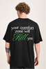 A warning, a mantra, a flex this oversized black t-shirt doesn’t whisper, it shouts: Your Comfort Zone Will Kill You. The word KILL pops in striking green, turning the message into both a graphic statement and a mindset. A clean black base, heavy cotton feel, and loose oversized cut make it an everyday piece that still hits with intensity. Styling Tip: Rock it with black joggers, neon sneakers, and a cap the green detail ties in perfectly.