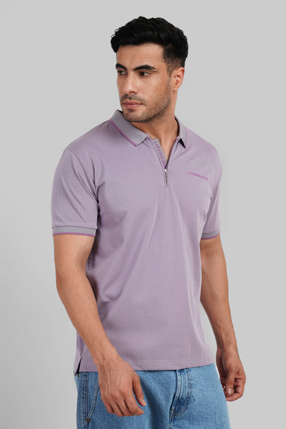 Attractive color without the commotion. With its subtle contrast, this men's polo neck t-shirt set stands out. The lavender tee's subtle Underrated branding is complemented by a hot pink zipline and trims. The set's black t-shirt mimics the same zip detail to create contrast and coherence. Both pieces are clean, fitted & made with high-quality pique fabric that has been stretched to maintain its shape over time. Wear them with shorts or tucked into wide-leg pants for a look that transitions from gallery day to laid-back evening.
