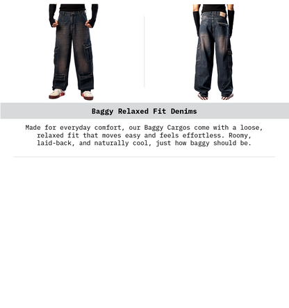 Rusty Blue Mid-Rise Baggy Cargo Jeans for Men is a Baggy fit, stacked with multiple cargo pockets and a slit pocket opening for utility vibes. Washed down with PP spray + a green tint, layered with hard whiskering for that rugged, lived-in energy. Finished off with a textured brand label, our signature arcuates on the back pockets, branded buttons & rivets, a PU badge on the waistband, plus the coin pocket and label that seals the deal.